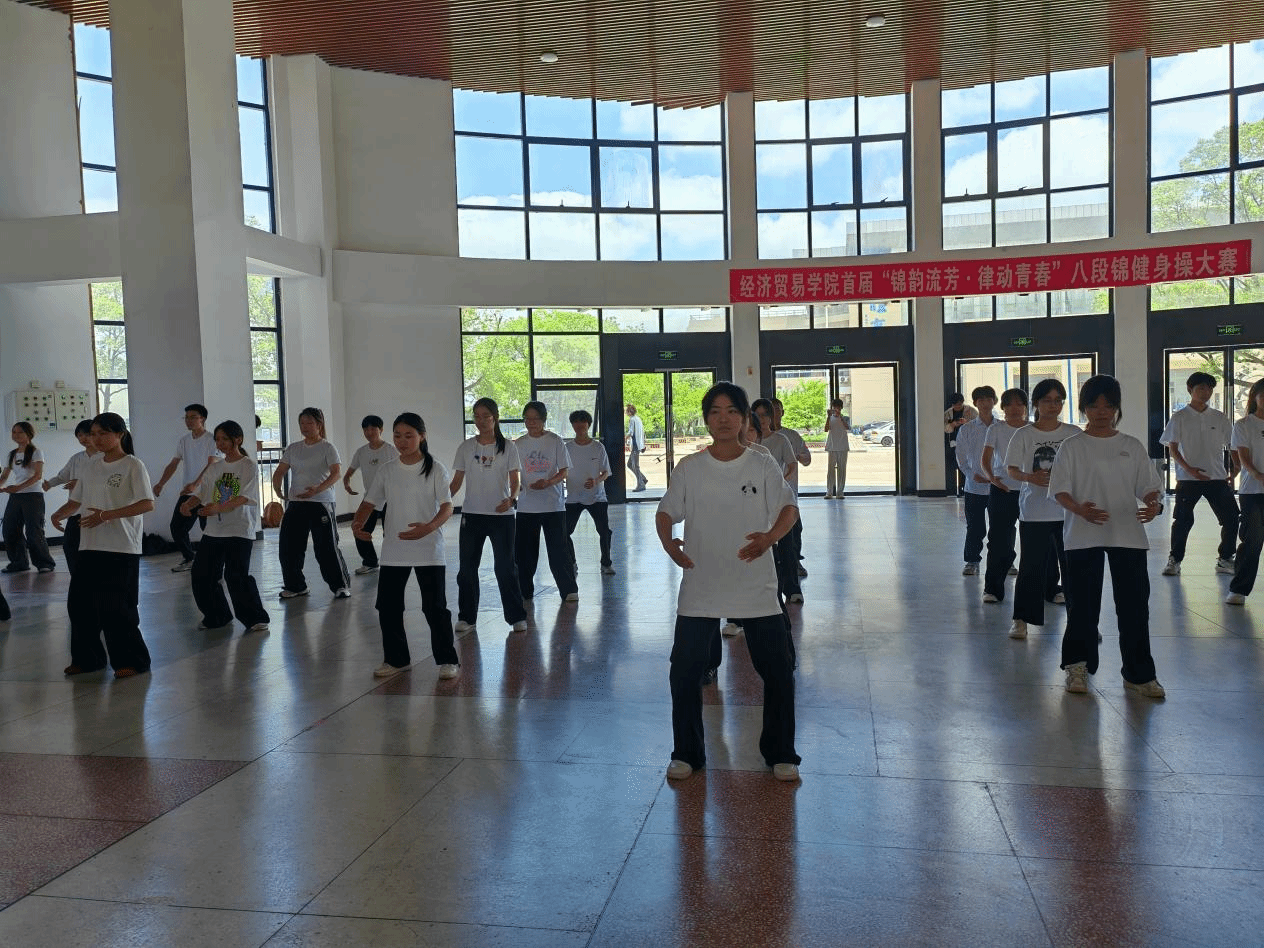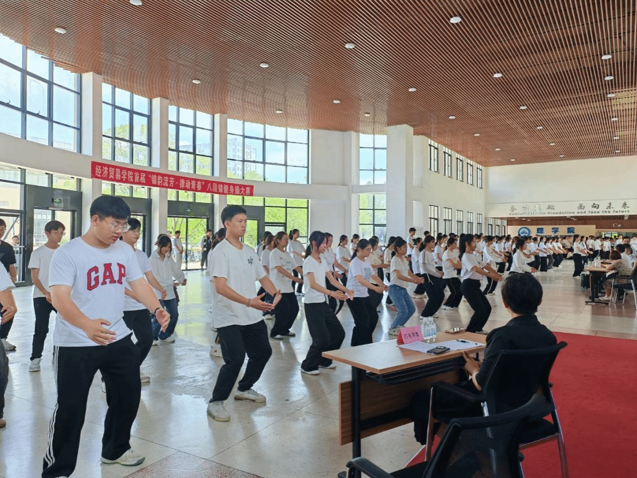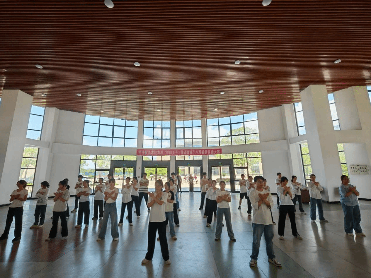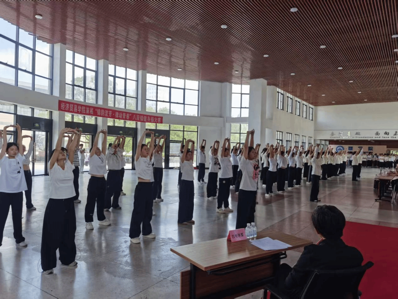 刘志强在开幕词中强调,八段锦作为国家级非物质文化遗产,兼具舒缓柔美与强身健体的特点,希望同学们通过比赛领悟“动静结合”的养生智慧,展现经贸学子的青春风采。辅导员杨文凯详细介绍了八段锦比赛的评分规则。比赛中,同学们身着统一的服装,动作整齐如一,将“两手托天理三焦”“左右开弓似射雕”等经典招式演绎得如行云流水,举手投足间尽显八段锦的柔美与力度,凭借规范的动作和流畅的衔接,精彩地呈现了八段锦的精髓所在。同学们精神抖擞、动作连贯,充分展示了新时代经贸学子的精神风貌和积极向上的团队精神。