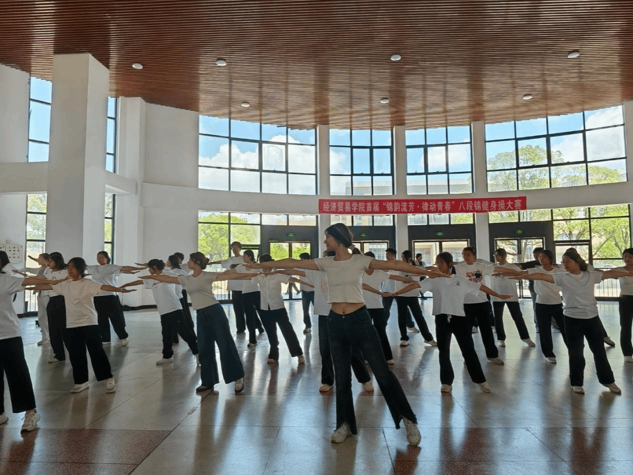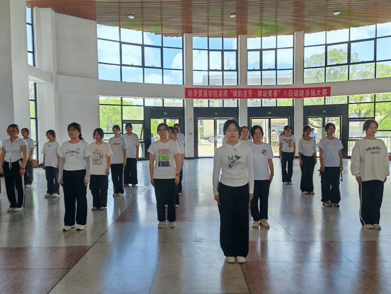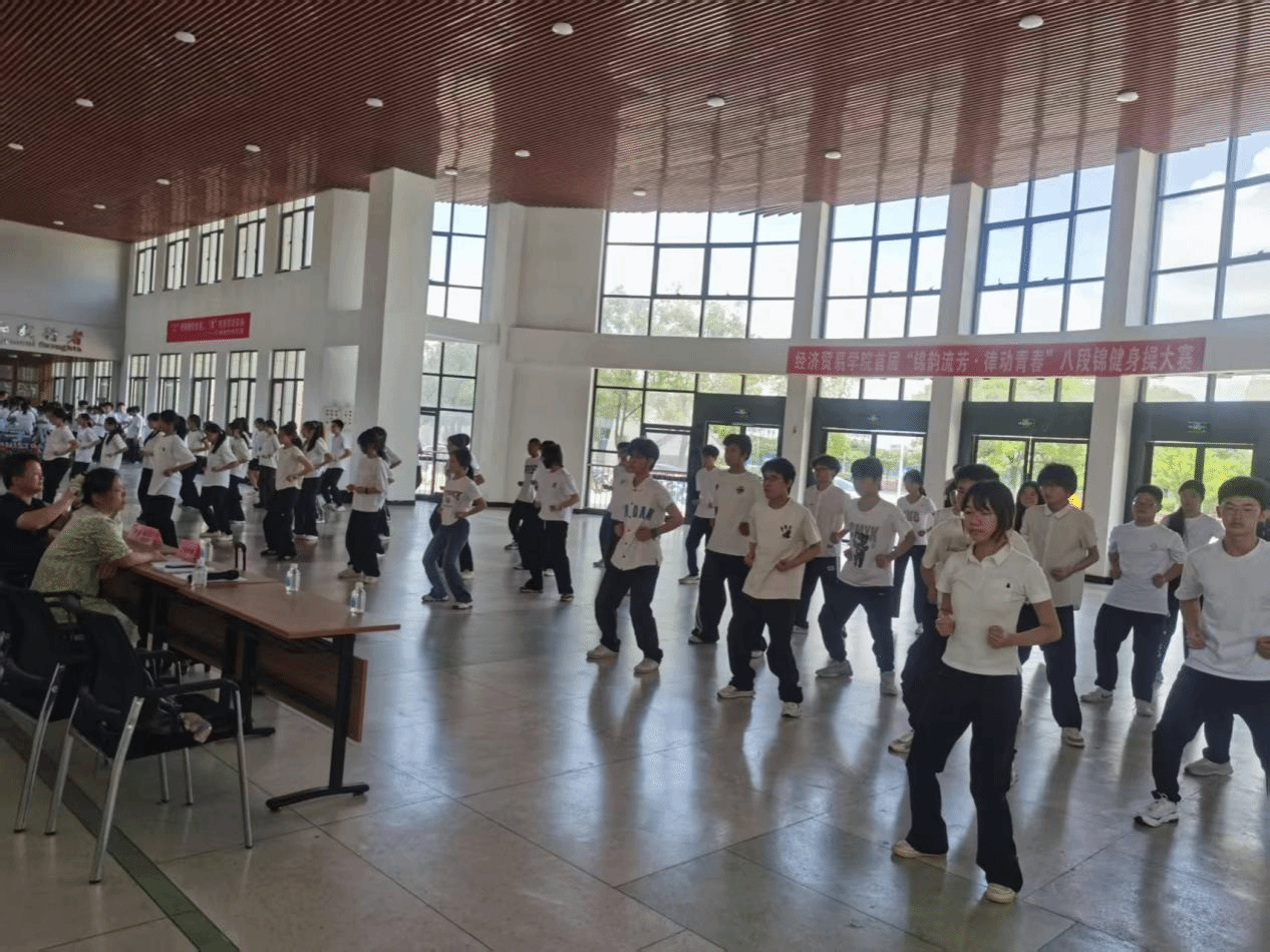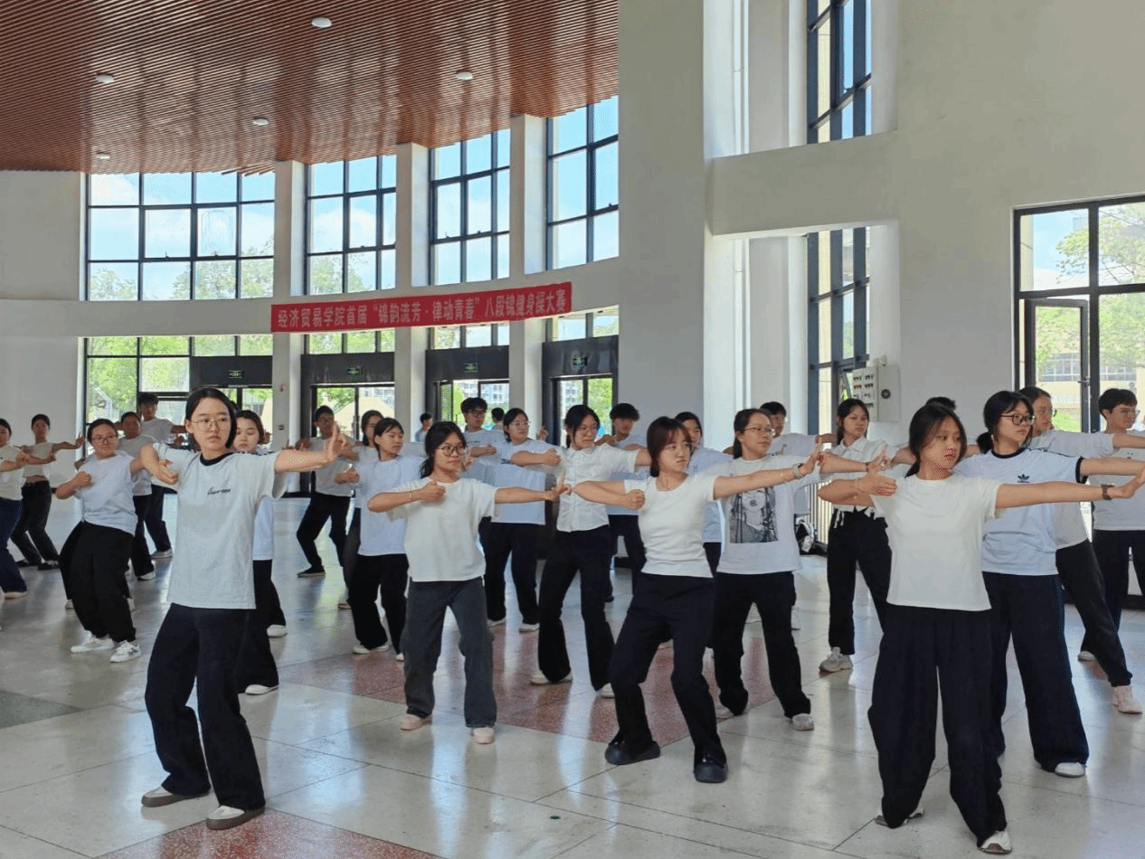 刘志强在开幕词中强调,八段锦作为国家级非物质文化遗产,兼具舒缓柔美与强身健体的特点,希望同学们通过比赛领悟“动静结合”的养生智慧,展现经贸学子的青春风采。辅导员杨文凯详细介绍了八段锦比赛的评分规则。比赛中,同学们身着统一的服装,动作整齐如一,将“两手托天理三焦”“左右开弓似射雕”等经典招式演绎得如行云流水,举手投足间尽显八段锦的柔美与力度,凭借规范的动作和流畅的衔接,精彩地呈现了八段锦的精髓所在。同学们精神抖擞、动作连贯,充分展示了新时代经贸学子的精神风貌和积极向上的团队精神。
