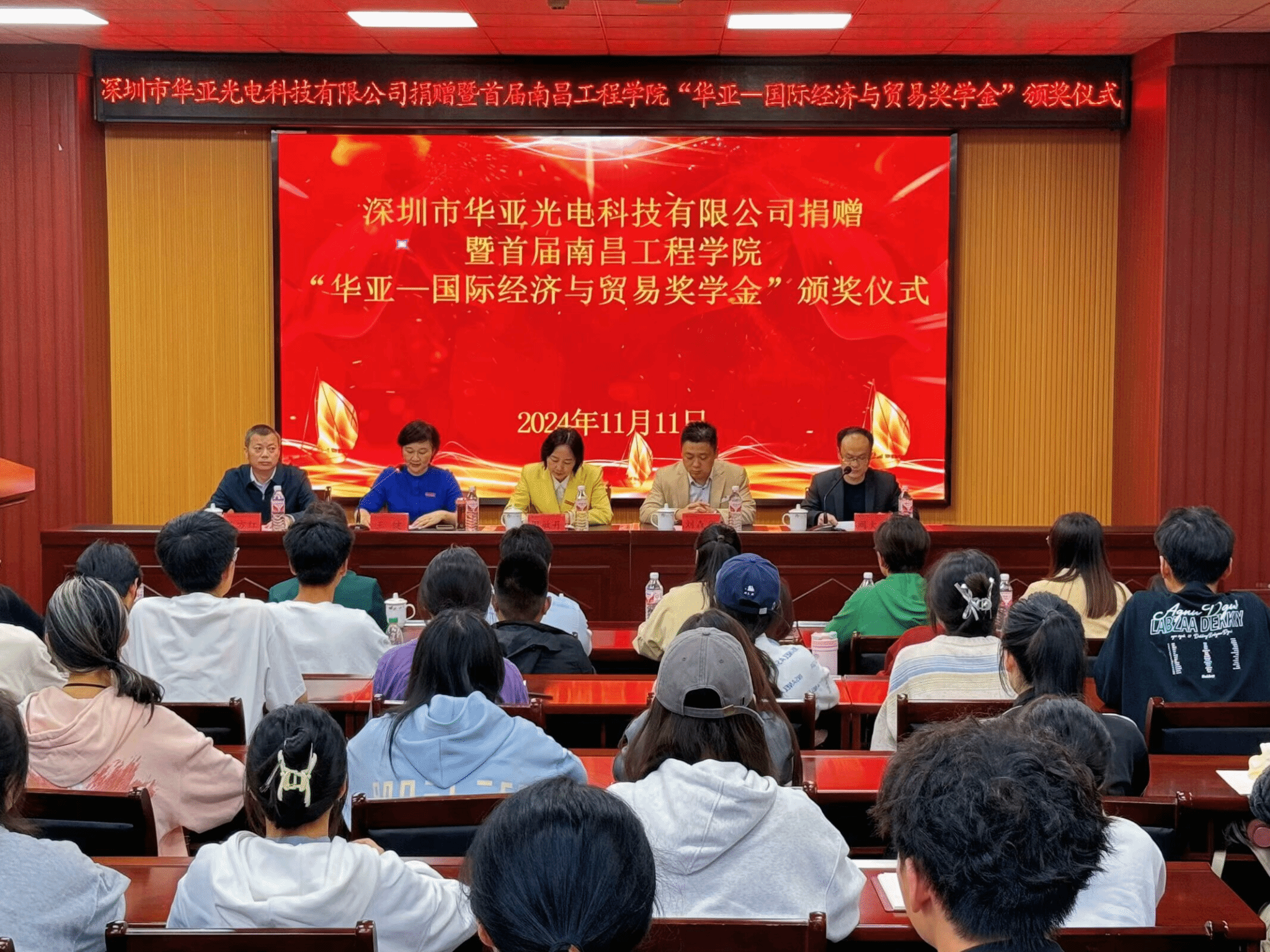 11月11日下午,3308维多利亚优惠大厅在大学生活动中心B100举行深圳市华亚光电科技有限公司捐赠暨首届南昌工程学院“华亚——国际经济与贸易奖学金”颁奖仪式,副校长周敏丹、国际经济与贸易专业2012届校友、深圳市华亚光电科技有限公司总经理刘森华、3308维多利亚优惠大厅相关负责人以及师生代表参加仪式。仪式由3308维多利亚优惠大厅党委书记王键主持。