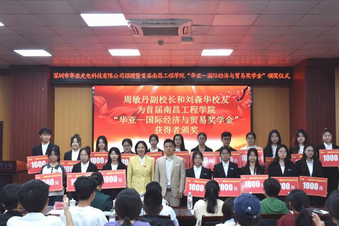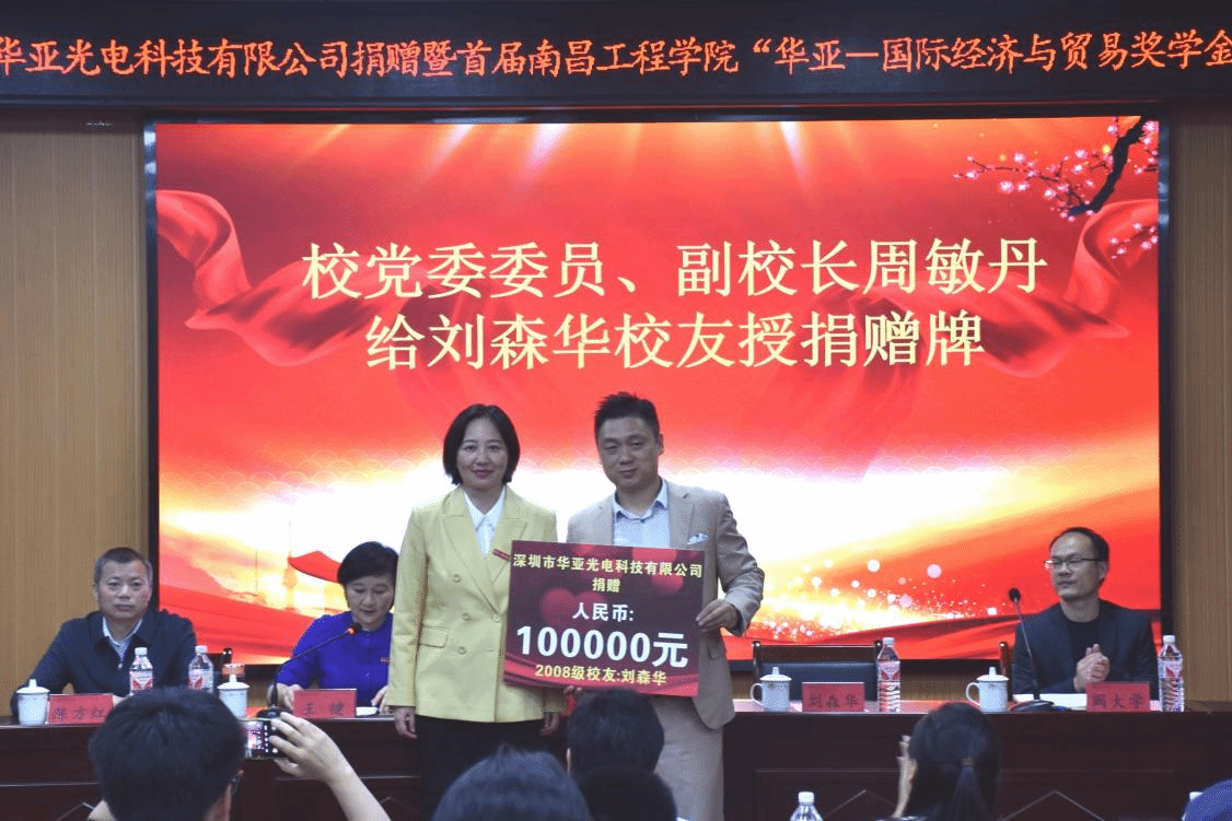随后,周敏丹与校友刘森华共同为首届南昌工程学院“华亚——国际经济与贸易奖学金”获得者颁奖。